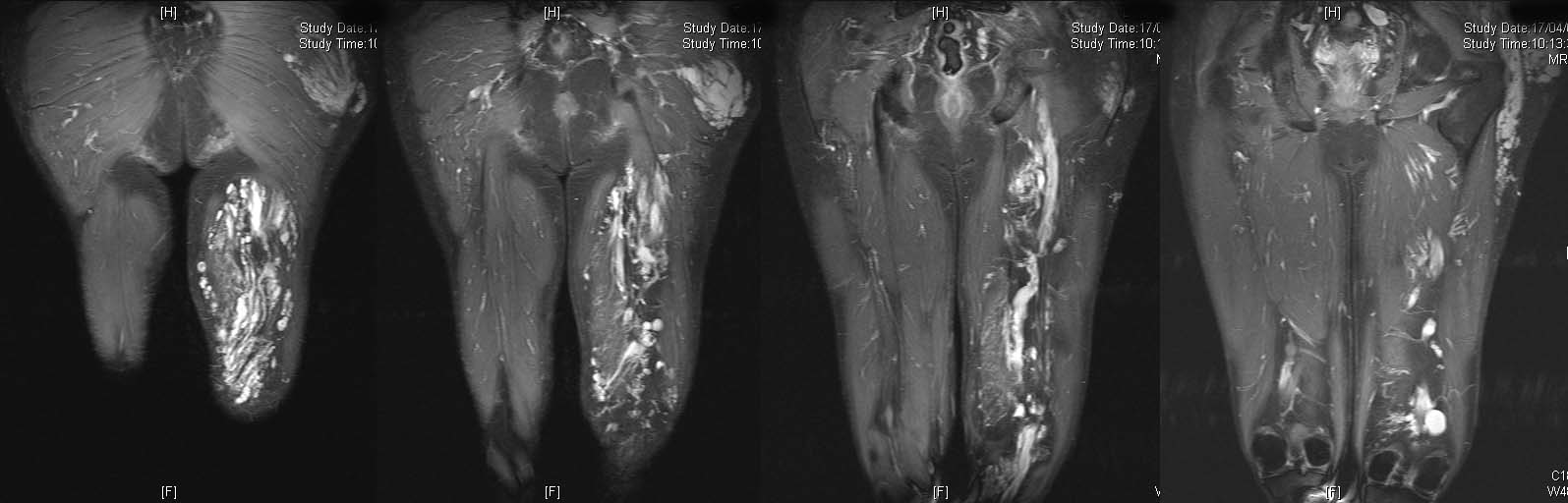 Arteriovenous malformation left buttock and thigh. Extensive lesion with serpiginous vessels against a background of a fatty stroma.